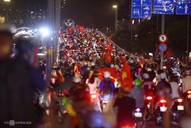 在胡志明市巴山桥桥头,大批球迷挥手庆祝越南队的胜利。